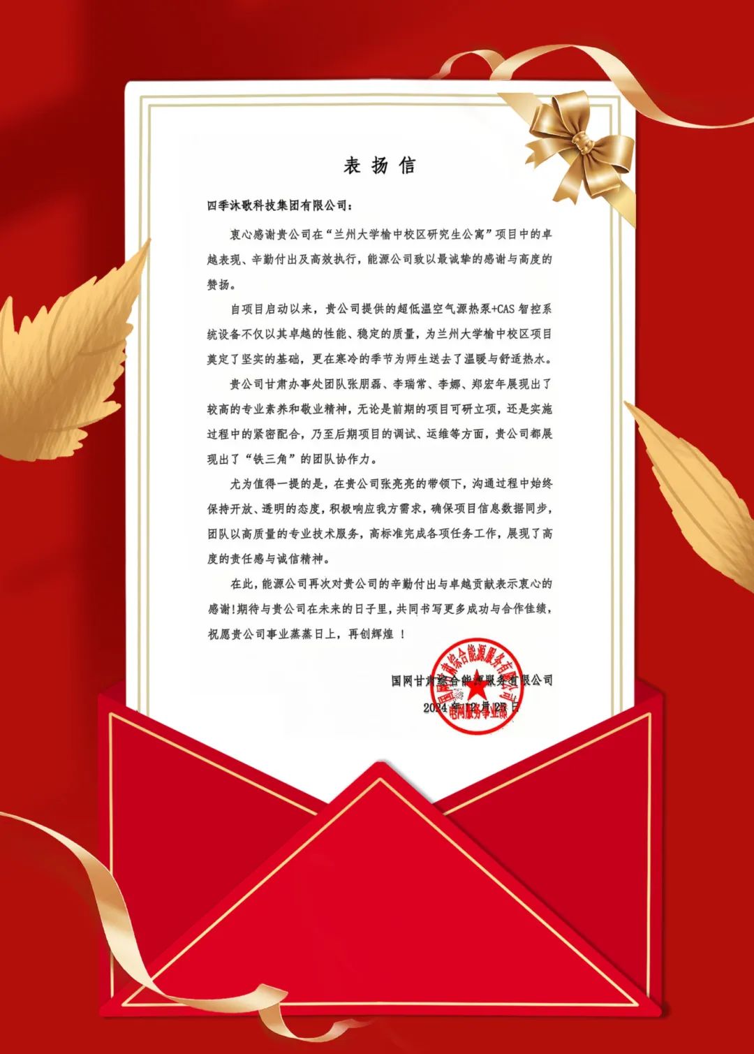 继二期工程顺利投入运行后,其出色的供暖及热水效果再次赢得了客户的一致好评。甘肃国网综合能源服务有限公司对四季沐歌甘肃团队所展现出的“铁三角”服务力给予了高度评价,不仅赞赏了四季沐歌热泵产品的卓越性能,还特别提到了CAS智慧控制系统在提升能源利用效率和优化能源管理方面的显著作用。