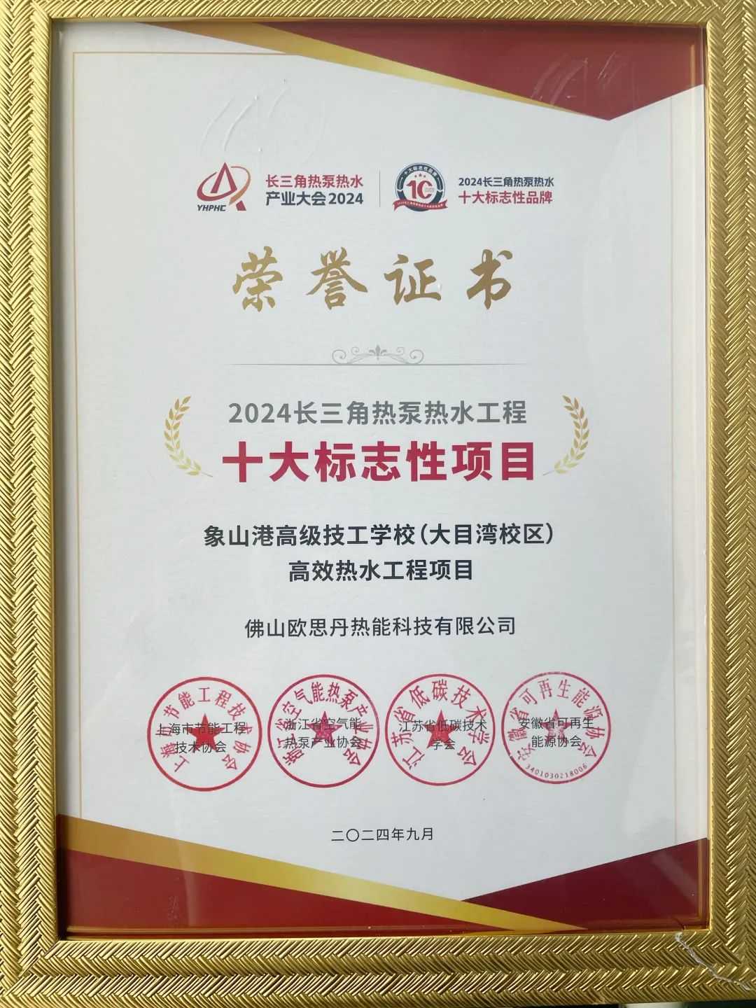 本次大会上,欧思丹打造的浙江宁波象山高级技工学校热水项目荣获“2024 长三角十大热泵热水工程标志性项目”。