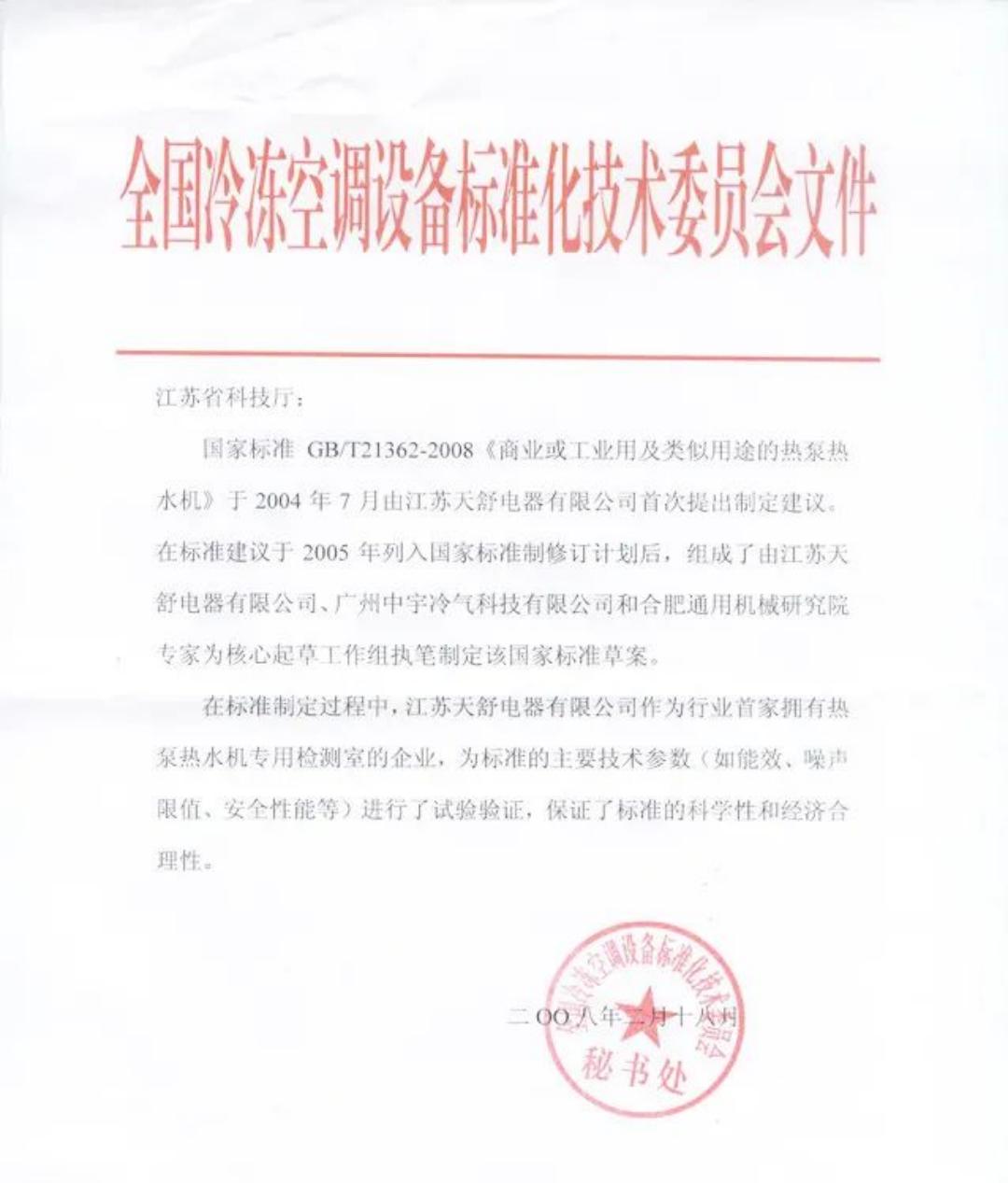 混乱且无序,是行业当时的状态——没有参数标准,没有产品型号,哪种热泵热水机才是规范且安全的?标准的出台迫在眉睫。于是,在天舒的率先倡议下,全国冷冻空调设备标准化技术委员会(简称“冷标委”)牵头行业内五家专业热泵企业主笔国家标准起草,天舒便是其中之一。