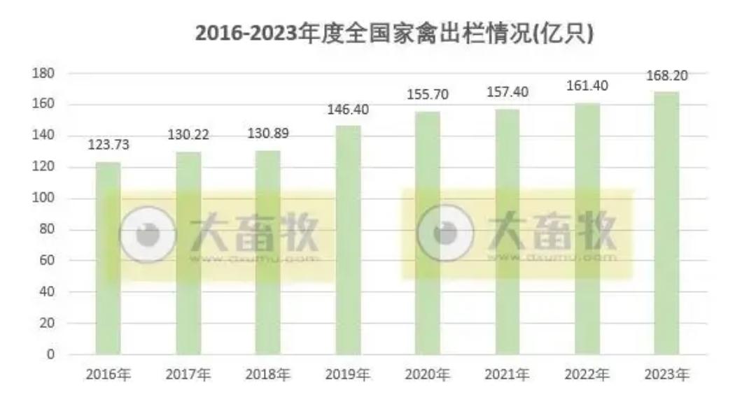 家禽养殖的主要产地集中在“山河四省”即河南、山东、河北、山西,以及东北地区,黑龙江、吉林、辽宁、内蒙古。据《温度新媒》主编孙晔成与中国畜牧兽医学会副秘书长、世界家禽学会亚太联盟主席马闯沟通后了解到:2023年,全国禽肉产量超过2500万吨,主要产区禽肉产量近1000万吨,占全国总产量的40%。家禽出栏168.2亿只,比2022年增长4.2%,2023年末家禽存栏约68亿只,从2020-2023年末,存栏数基本一致。