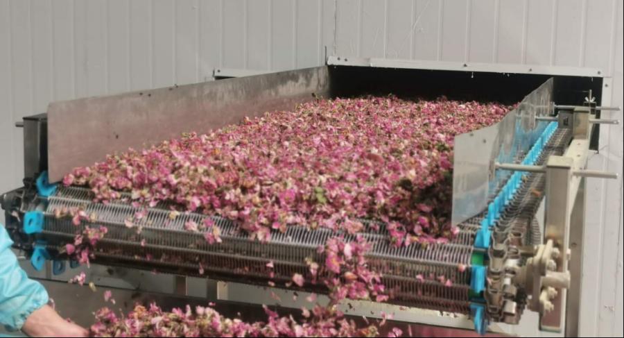 烘干分成三个阶段。温度从48℃到58℃依次提升,除湿连续不停止,烘干时间12-14小时。完成后,从鲜花色泽、气味、外形、手感等各方面进行人工检测干花品质,确认品质为佳,再由网带输送机把干花从烘房内导出。