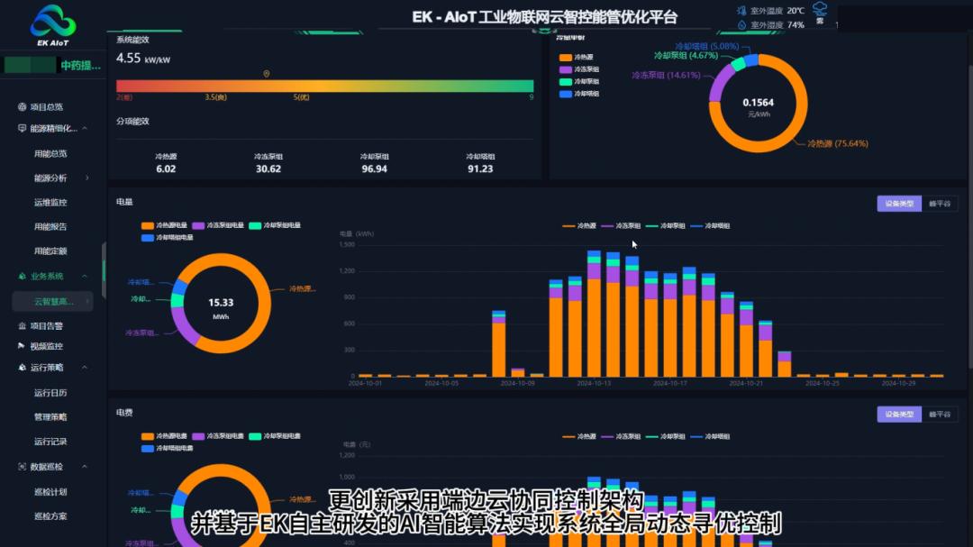 在能效优化方面,系统不仅提供实时与历史能效数据的对比分析,更创新采用端边云协同控制架构,并基于EK工业空调自主研发的AI智能算法实现系统全局动态寻优控制,持续自主学习和优化,最大化节能降耗效果。