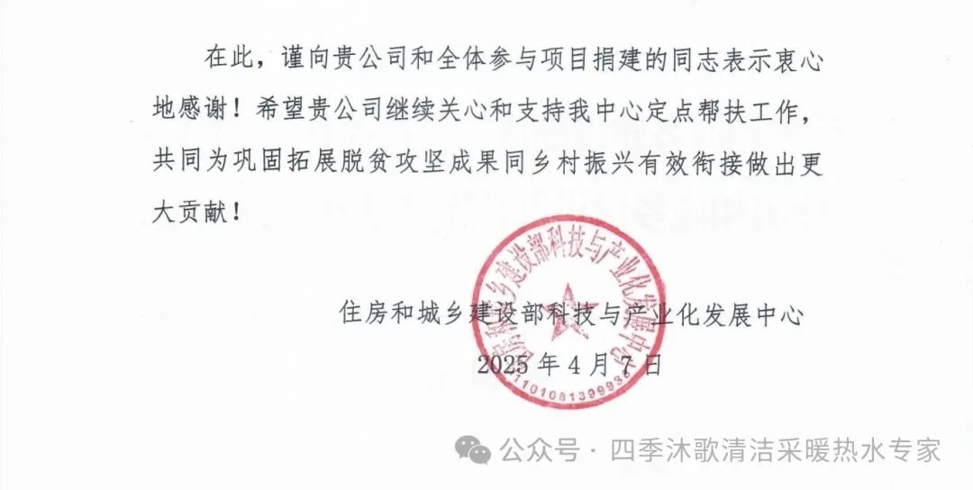 近日,四季沐歌收到一封来自 “住房和城乡建设部科技与产业化发展中心” 的感谢信,信中高度肯定了四季沐歌在青海省玉树市代格村集体经济项目帮扶工作中做出的突出贡献。