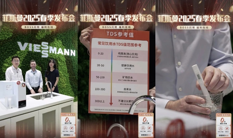 菲斯曼天猫旗舰店直播间以“Boss 闪现,福利在线”为开场,开利暖通空调北亚区总裁余敏义、开利北亚区家用及轻商舒适家居解决方案总裁詹思培(James Spillane)、菲斯曼气候解决方案中国大陆及香港地区总经理王玮亲临菲斯曼天猫旗舰店直播间,以“技术讲解、场景演示、福利放送”相结合的互动形式,向全国消费者重磅推出两大创新产品:搭载超低温制热技术的菲斯曼空气源热泵Vitocal 100-A CN (S), 以及搭载高效反渗透膜片的Vitopure 100-RO V1家用直饮净水机。
